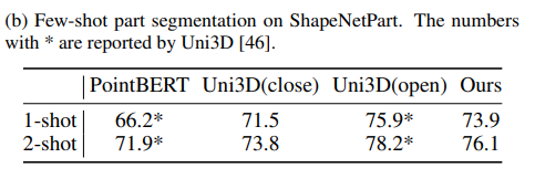 FM은 다양한 task에 맞게 fine tuning하여 사용할 수 있는데, (b)는 Point-SAM의 part segmentation에 대한 성능을 리포팅하고 있습니다. ShapeNetPart라는 데이터를 사용해서 클래스 전체에 대한 mIoU_C를 평가하였습니다. few shot 학습 중에는 인코더를 freeze하고 CE loss를 사용해서 feature propagation과 MLP만 최적화하였다고 합니다. Uni3D는 원래 ov part segmentation이기 때문에 이를 Uni3D(close)로 표시하고, 본 논문과 같이 세팅하여 Uni3D(close)를 따로 비교 모델로 선정하였다고 합니다. Point-SAM은 기존 Uni3D(open)보다는 낮은 성능을 보이지만 두 PointBERT와 Uni3D(close) 대비 높은 성능을 보이며 여러 downstream task에서의 활용 가능성을 보여주고 있습니다.