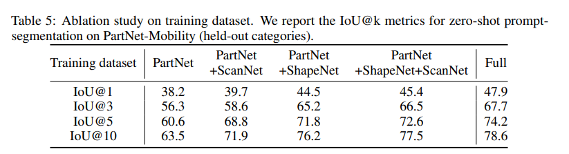 모든 경우에서 데이터셋을 확장할 수록 좋은 성능을 보이는 것을 우선 확인할 수 있습니다. 또한 PartNet+ShapeNet으로 학습된 모델은 특히 단일 프롬프트에서 훨씬 더 나은 성능을 보이고 있는데, 단일 프롬프트가 들어오게 되면 아무래도 정보가 모호해지기 때문에 IoU@1 성능을 통해 모델이 충분히 마스크의 다양성을 찾을 수 있는지 여부를 판단할 수 있었습니다. 점점 더 규모가 커지고 다양한 영역에 대한 어노테이션이 활용될 수록 OOD 데이터에 대한 zero shot 성능도 비례하여 향상되는 것을 확인할 수 있습니다.