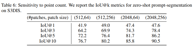 앞서 이야기한 것처럼 포인트는 매우 irregular한 특성을 가지고 있는데, 학습에 사용된 포인트보다 더 많은 포인트를 처리할 때는 패치 수와 크기를 적절히 조정해야 합니다. 따라서 이 패치 수와 크기라는 하이퍼파라미터의 효과를 ablation study를 통해 확인하였다고 합니다. Tab.6은 S3DIS라는 indoor datset에 대한 zero shot prompt segmentation 결과를 보여주고 있습니다. S3DIS 데이터셋은 포인트의 평균 수가 학습 데이터셋의 거의 50배에 해당하는 약 500만 개의 포인트를 가지고 있는데, 결과를 보시면 더 큰 규모의 포인트를 활용하기 위해서는 많은 패치 수를 사용하는 것이 중요하다는 것을 보여주고 있습니다 . . 사실 어쩌면 당연한 얘기일 수도 있다고 생각이 들긴 하네요. 한 데이터 안에 들어있는 포인트가 많을 수록 큰 패치 수를 사용하는 것이 어쩌면 당연하게 받아들여질 수도 있을 것 같은데 여하튼 실험을 통해서 이를 증명했다고 합니다. 또한 패치 수 뿐만 아니라 학습 데이터의 분포와 비교했을 때 샘플링하는 중심 포인트 주변에 있는 이웃 포인트들의 분포 밀도도 더 dense할 것이기 대문에 패치 크기를 확대하는 것 역시도 필요하다는 걸 해당 ablation study를 통해 보여주고 있습니다.