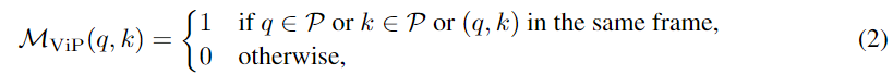 저자는 또한 일반적인 ViT에 대한 proxy-guided attention mechanism을 설계합니다. ViT에서는 기본적으로 어텐션을 사용하여 토큰 간 관계를 학습합니다. proxy-guided attention mechanism는 비디오 프록시 토큰과 패치 토큰이 다르게 어텐션을 계산하도록 설계합니다. 비디오 프록시 토큰의 경우 모든 토큰에 어텐션을 사용하여 비디오 전체의 사간적 정보를 통합하고, 패치 토큰은 같은 프레임의 패치 토큰들과 비디오 프록시 토큰만 참조합니다. 이 메커니즘은 attention 마스크M_{ViP}로 표현됩니다: