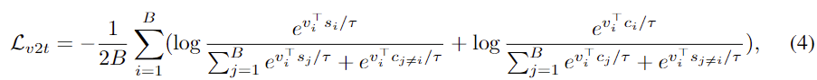 여기서 v_i와 t_j는 각각 배치 크기 B에서 X ∈ {V, F} 의 i번째 시각적 피처 Y ∈ {S, C}의 j번째 텍스트 피처의 정규화된 임베딩입니다. 전체 손실 LX↔Y는 L_{v2t}와 L_{t2v}의 평균으로 구해집니다.