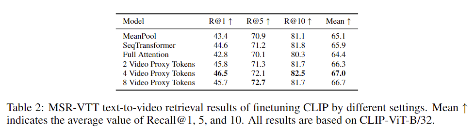 Video Proxy Mechanism : 이 실험에서는 비전 인코더에 대한 Video Proxy(ViP) 메커니즘을 평가합니다. ViP를 다른 수의 프록시로도 평가하고 MeanPool, SeqTransformer, Full Attention과 같은 다른 모델 구조와도 비교합니다. MeanPool은 프레임 특징의 평균을 구해 전체 비디오의 피처를 뽑는 방식입니다. SeqTransformer은 CLIP4Clip의 seqTransf와 CLIP4Clip에서의 residual connection을 따릅니다. Full Attention은 모든 패치 토큰을 비전 인코더의 입력으로 사용하며 모든 토큰에 걸쳐 attention 이 이루어집니다.
