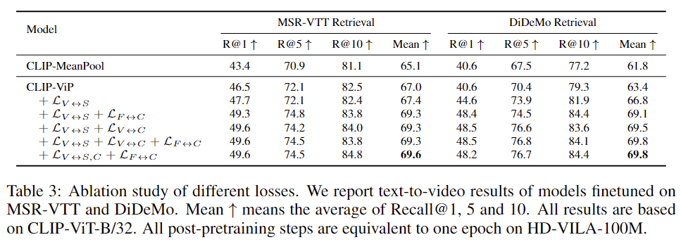 저자는 비용이 많이 드는 훈련 때문에 각 손실 함수로 모델을 단 한 번의 에폭만큼 사전 훈련한 후, 두 개의 비디오-텍스트 검색 데이터셋인 MSR-VTT와 DiDeMo에서 파인튜닝 합니다. 결과는 제안된 비디오 프록시 메커니즘(CLIP-ViP)을 사용하여 CLIP-MeanPool 및 CLIP와 비교합니다.