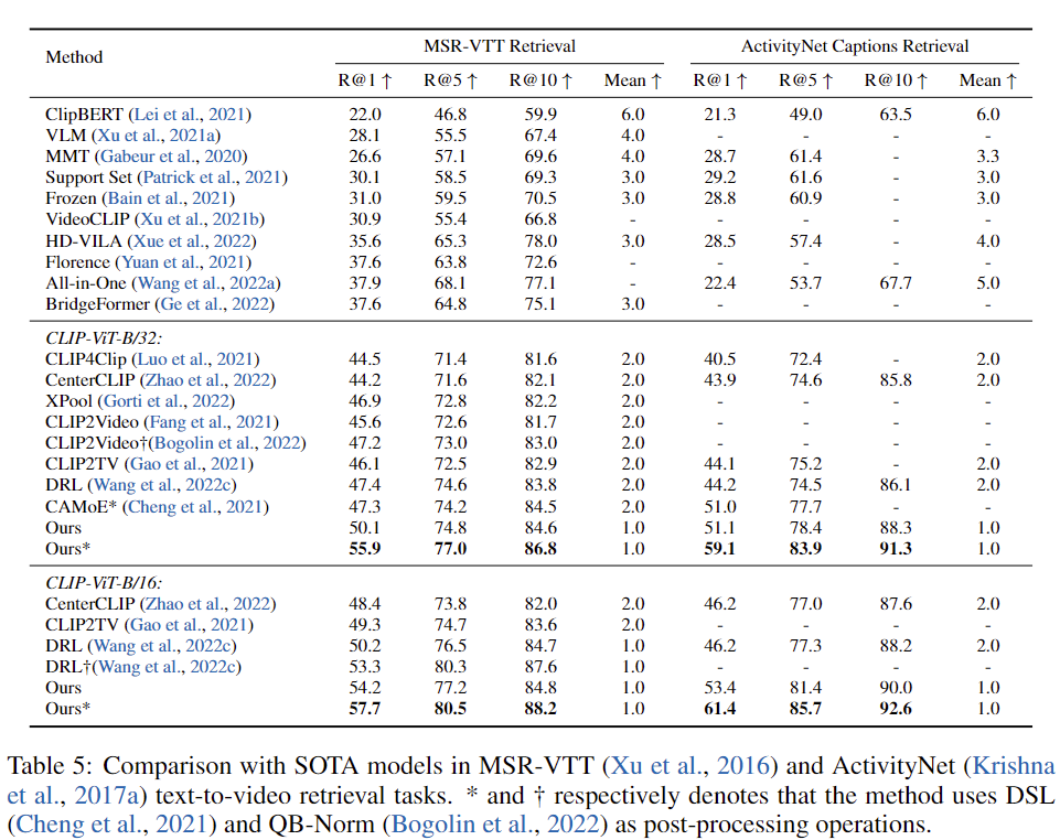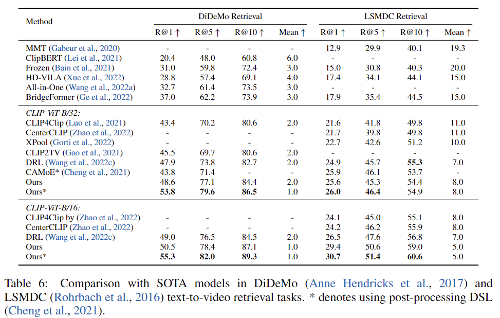 저자는 text-to-video retrieval task에서 다른 모델과 비교합니다. 네 개의 데이터셋( MSR-VTT, DiDeMo, ActivityNet Captions, LSMDC)에 대한 파인튜닝 결과는 표 5와 6에 나타나 있습니다. 저자의 모델은 CLIP-ViT-B/32 및 CLIP-ViT-B/16의 모든 데이터셋에서 가장 좋은 성능을 보여주고 있습니다. 기존 방법은 CLIP 모델을 많이 수정하거나 새로운 구조를 추가해야 적용할 수 있는 경우가 많습니다. 하지만 저자의 모델은 CLIP 모델에 거의 변화를 주지 않았기 때문에, CLIP을 기반으로 설계된 기존 방법에도 쉽게 이 모델 위에 적용할 수 있습니다. 또한 DSL 같은 후처리 작업이 없어도, 저자의 모델은 대부분의 데이터셋에서 이미 후처리를 사용하는 기존 방법보다 더 나은 성능을 보여줍니다.