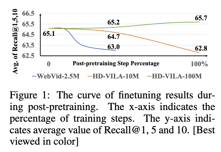 결과는 그림 1에 나와있습니다. 그래프를 보면 지속적인 post-pretraining이 성능 저하로 이어지는 과적합 현상을 관찰합니다. 이는 WebVid-2.5M, HD-VILA-10M와 같이 데이터 규모가 작은 경우에 더욱 두드러집니다. CLIP은 4억 개의 이미지-텍스트 쌍으로 사전 훈련되었기 때문에, 작은 데이터에 대한 추가 훈련은 모델이 새로운 데이터에 과적합하는 경향을 갖게 하며, 이미지-텍스트 쌍에서 얻은 지식을 잃어버리는 모습을 보입니다. 그 결과 성능이 저하되고, 사전학습된 CLIP을 직접 사용하는 것보다 나빠질 수 있습니다. 따라서 저자는 대규모의 다양한 범주를 가진 HD-VILA-100M을 post-pretraining으로 선택합니다.