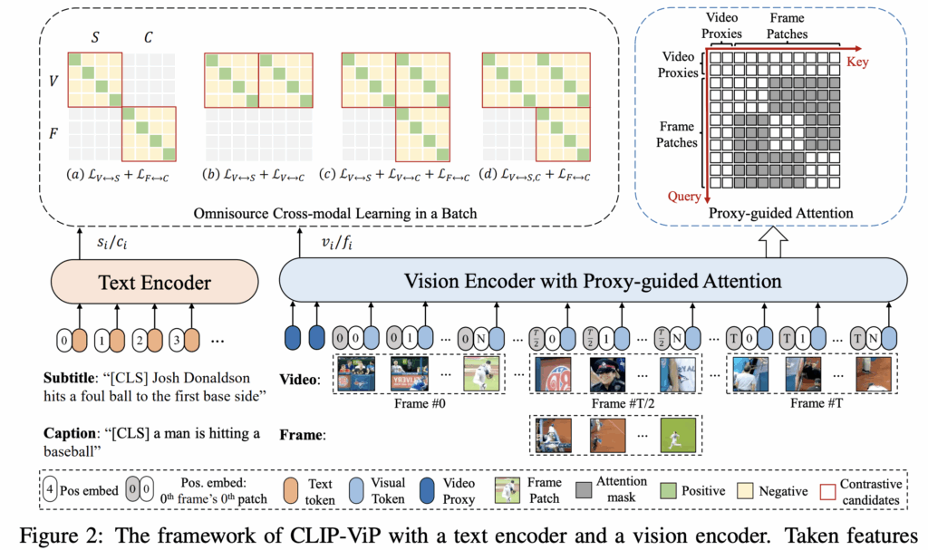 CLIP-ViP은 이미지와 비디오를 모두 처리할 수 있도록 Transformer 기반 비전 인코더를 학습시키기 위해, video proxy tokens과 ViT를 위한 proxy-guided video attention mechanism을 설계합니다. 또한 저자는 캡션-프레임 , 비디오-자막 데이터의 cross-modal representation learning 을 동시에 하기 위해, Omnisource Cross-modal Learning(OCL) 방법을 제안합니다.