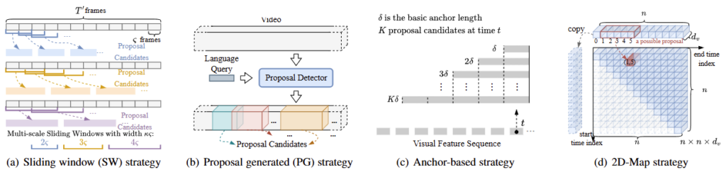 이미지 내에서 객체를 localizing하는 Object Detection과 비슷하게 VMR은 영상의 temporal 축에서 구간을 localizing하는 task이기에 Object Detection에서의 연구의 흐름과 유사하게 흘러갑니다. VMR task가 최초 제안될 때에는 비디오로부터 feature를 추출하고 sliding window(SW)를 활용하는 방식(a)을 통해 VMR이 수행되었습니다. 그 이후 Proposal을 생성하는 Proposal Generated(PG) 방식(b), Anchor box를 통한 예측을 수행하는 Anchor-based 방식(c)으로 연구되었습니다. (d) 2D-Map 방식은 기존 방식과 다르게 영상의 구간을 2차원의 map으로 termpoal relation을 모델링합니다. 가로를 end-timestamp, 세로를 start-timestamp로 생각해 start-timestamp로부터 end-timestamp까지의 유사도가 활성화되는 것을 통한 예측을 수행합니다. 위 4가지 방법 모두 장단점이 존재하지만, 최근에는 위 4가지 방법이 아닌 DETR기반의 프레임워크를 따릅니다.