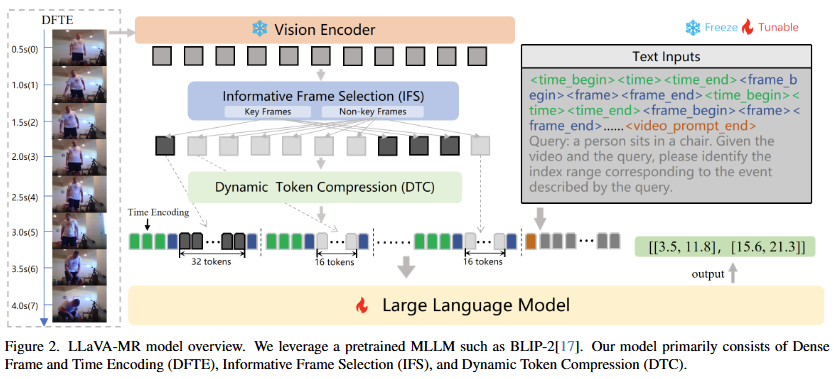 따라서, 저자는 MLLM의 사전지식을 잘 활용하는 동시에 효율적인 연산을 위해서 먼저 영상을 fine-grained level로 인코딩하고 중요한 구간과 중요하지 않은 구간을 나눕니다. 그리고 나서 중요하지 않은 구간의 정보를 압축하는 것으로 정보의 누락을 최소화시키면서 동시에 연산량을 줄입니다. 위 과정을 통해 저자는 연산량이 기하급수적으로 늘어나지 않게 하면서 동시에 fine-grained level에서의 구간을 localizing할수 있는 프레임워크를 제안할 수 있게됩니다.