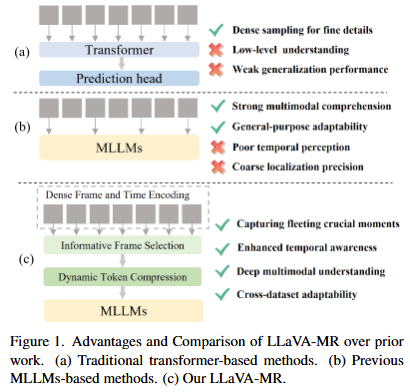 VMR task는 영상과 텍스트를 입력으로 받아 영상 내에 존재하는 텍스트가 설명하는 구간을 반환하는 task입니다. LLaVA-MR은 이름에서 추측할 수 있듯이 MLLM foundation 모델인 LLaVA모델을 VMR에 활용하는 연구입니다. 앞서 저자가 언급한 한계들로 인해 MLLM을 바로 VMR에 사용하는 것은 효율적이지 못합니다. 실제로 여러 MLLM 연구들이 여러가지 video-text task에서 벤치마킹을 하며 자신들이 제안하는 MLLM 모델이 VMR을 포함하는 여러 task를 동시에 fine-tuning없이 수행할 수 있는 효과적인 모델임을 증명하고 있지만, 단일 task를 수행하는 프레임워크에 비하면 낮은 성능을 보여주고 있었습니다. 저자는 총 3가지 모듈을 통해 MLLM을 단일 task에 수행하면서 생기는 문제점들을 해결하려 했습니다. 3가지 모듈에 대한 설명 전에 기존 VMR 연구들의 흐름을 한번 짚어보겠습니다.