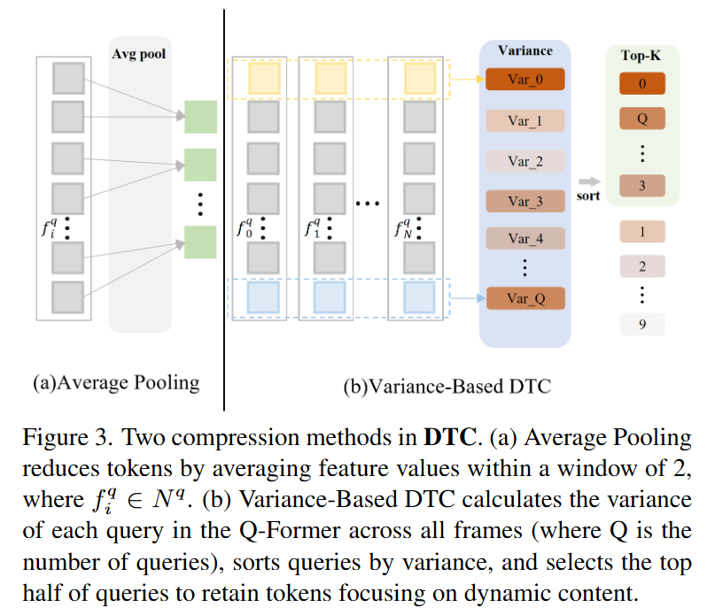 저자는 크게 두가지 방법을 통해 Dynamic Token Compression(DTS)를 진행합니다. Figure 3.에서 보이는 Average Pooling과 Variance-Based DTC입니다. Average Pooling은 주어진 window(key frame 사이의 구간으로 중요하지 않은 프레임들의 집합을 window라 표현) 내에서 특징 값을 평균 풀링하여 압축하는 방법입니다. 저자는 이 방법이 naive하면서도 동시에 꽤나 효과적인 방법이라고 강조하고 있습니다. 두번째는 분산 기반의 DTC로 Q-Former를 이용합니다.