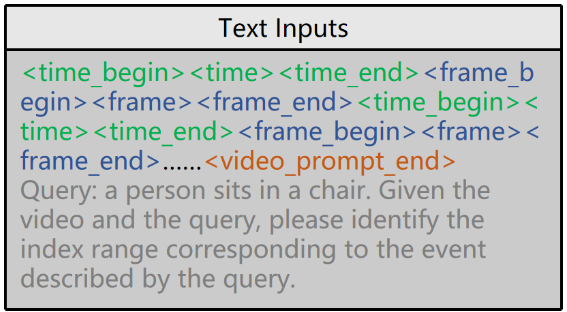결국 마지막에는 DFTE, IFC, DTC를 통해 얻은 feature로 input sequence를 생성해 LLM에 입력합니다. input sequence는 text input을 마지막에 추가해 LLM에 입력합니다. text inputs은 Figure 2 우측으로 아래의 그림과 같습니다.