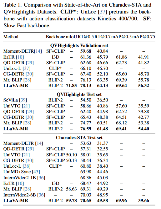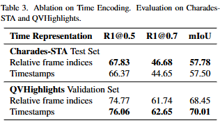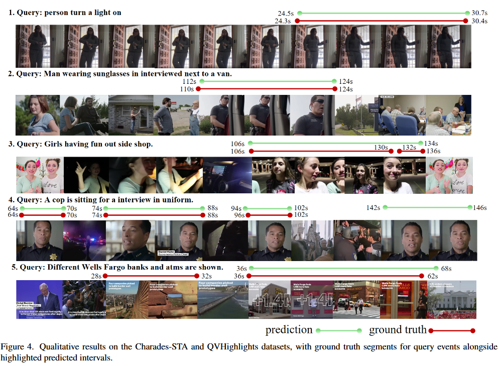 - 위 과정을 통해 저자는 두 벤치마크 (Charades-STA 데이터셋, QVHighlights 데이터셋)에서 SOTA를 달성합니다.
