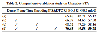 (a) 는 베이스라인 모델입니다. 기존 coarse frame sampling을 사용하는 기존의 MLLM을 활용하는 방법입니다. 저자는 (a) 실험을 통해 MLLM을 활용한 VMR의 feasibility를 실험했다고 말하고 있습니다. “MLLM만을 사용해도 성능이 잘 나오네? 한번 잘 다듬어서 논문 써봐야겠다” 정도로 생각한 것 같습니다. (b) 실험은 단순지 프레임 샘플링 수를 늘린 실험이라고 합니다. 얼마나 늘린 것인지에 대한 언급은 없지만, MLLM의 coarse frame extraction 문제를 실험을 통해 보여주고자 한 것 같습니다. (c) 실험은 input sequence에 대한 실험입니다. temporal representation을 강화하는 것으로 성능이 많이 올랐다고 말하고 있습니다. (d)는 저자가 제안하는 모든 모듈을 포함하는 성능입니다. 성능이 높은 폭으로 올랐음을 강조하며 각각의 모듈이 서로 잘 상호작용하고 있다고 강조하고 있습니다.