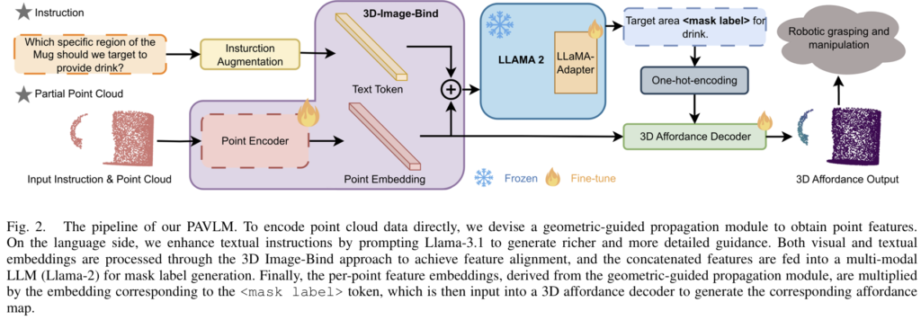 해당 논문에서 제안한 PAVLM은 Point Cloud P와 텍스트 intruction T가 주어졌을 때, <mask label>과 함께 3D affordance map을 생성하는 파이프라인으로 mask label은 point cloud와 합쳐저 정확한 affordance map을 생성하도록 합니다. 전체적인 파이프라인은 [Fig. 2]에서 확인할 수 있으며, 먼저 geometric-guiede point encoder를 통해 기하학적 feature를 추출한 뒤, feature의 정보를 풍부하게 만들기 위해 piont cloud embeding 의 추가합니다.(Section2.1) 그 다음, 데이터 증강을 통해 시스템의 추론 능력을 향상시키고자 프롬프트를 통해 Llama-3.1 LLM 모델을 활용하여 다양한 context-aware question-answer 쌍을 생성합니다.(Section2.2) 이후 사전학습된 3D Image-Bind 모델을 채택하여 point cloud embedding을 text token과 정렬하여 3D 데이터와 지시문 사이의 일관성을 확보합니다.(Section2.3) 그 다음 fine-tuniung된 Llama-2 모델을 사용하여 affordance mask labels를 생성하여 point cloud embeding과 통합한 뒤, 마지막으로 두 embeddings를 3D affordance decoder에 입력하여 최종적으로 정교한 affordance map을 만들어냅니다.(Section2.4) 이제 각 파트에 대해 살펴보겠습니다.