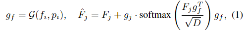 먼저 geometric information extraction 모듈은 point cloud P \in \mathbb{R}^{2080⨉3}를 k개의 point 패치로 만든 뒤, 각 패치들에 convolution 레이어를 적용하여 point-wise features \{f_i\}^k_{i=1}를 생성합니다. 이 feature들은 positional embeddings \{p_i\}^k_{i=1}와 합쳐진 뒤, cross-attention 매커니즘으로 이루어진 일련의 transformer 블록을 통과하여 refine된 geometric features \{g_i\}^k_{i=1} 생성합니다. 이때 transformer blocks은 3개의 레이어로 구성되며, 해당 과정은 아래의 식으로 표현할 수 있습니다.