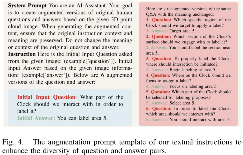 저자들은 더 풍부하고 3D 구조에 특화된 augmentation question-answering 쌍을 만들기 위해 Llama-3.1 7B모델을 활용하였다고 합니다. Llama-3.1은 명령어를 처리하고, 사전학습된 지식을 기반으로 응답을 출력하여 보다 상세하고 맥락 정보를 고려할 수 있도록 하였다고 합니다. 프롬프트의 예시는 아래의 [Fig. 4]에서 확인하실 수 있으며, 구체적으로는 K개의 카테고리가 포함된 3D dataset에 대해 <mask label>을 해당 카테고리로 바꾸고, Llama-3.1에 그림과 같은 명령어를 주어 의미는 유지하지만 표현을 다양하게 augmentation하였다고 합니다.