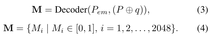 앞의 과정을 통해 align을 강화한 feature embeddings는 사전학습된 multi-modal Llama-2 모델로 입력되고, Llama-2의 대부분은 freeze하고 LLaMA-adapter를 finetuning하여 <mask label>을 예측합니다. output label은 인코딩하기 위해 one-hot-encodding을 적용하여 query embedding q로 변환한 뒤, 이를 원래의 Point cloud P와 concat하고 point cloud의 embedding P_{em}과 함께 3D affordance Decoder에 통합됩니다. Decoder는 2개의 convolution 레이어와 batch normalization layer로 구성되며, 멀티모달 feauture embedding의 차원을 줄이고, point cloud의 각 점에 대한 affordance map M \in \mathbb{R}^{2048⨉1}를 생성하도록 학습됩니다. 각 점에 대한 M_i \in [0,1] 은 각 점의 affordance 점수를 의미하며 해당 과정은 아래의 식으로 정리할 수 있습니다.
