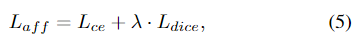 geometric-guided encoder와 3D affordance decoder를 학습하기 위해 affordance loss L_{aff}를 이용합니다. affordance loss L_{aff}는 cross-entropy lossL_{ce}와 Dice loss L_{Dice}의 가중합으로 이루어지며, 아래의 식으로 정리됩니다.