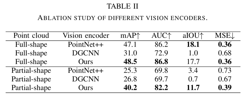 - Object, Action과 Action의 성능 비교를 통해 Object보다 Action이 Point cloud embedding과 결합했을 때 더 좋은 성능을 보임