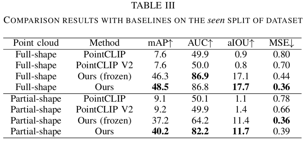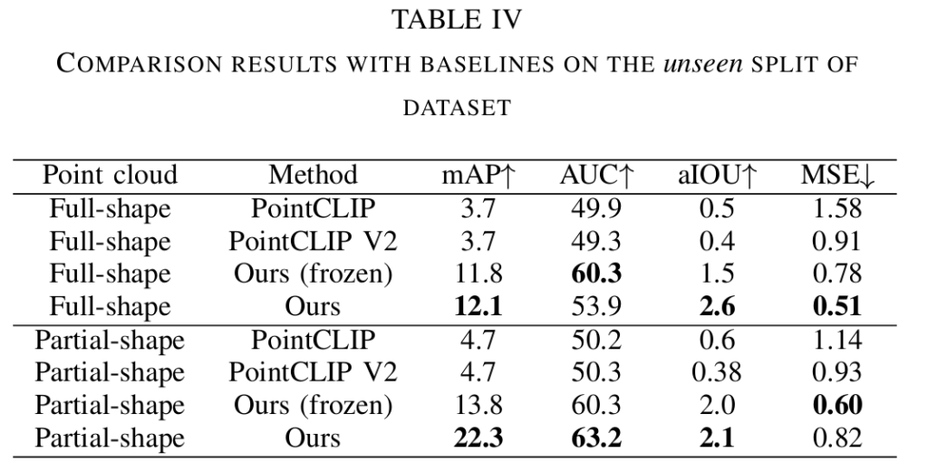 - 3D-AffordanceNet 밴치마크에서 SOTA 달성 및 새로운 카테고리의 객체에 대한 강력한 일반화 능력 입증