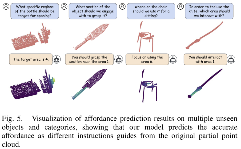- 위의 [Fig. 5]는 unseen 카테고리에 대한 정성적 결과로, question이 주어졌을 때 affordance map을 시각화 한 것입니다. 위의 text와 point cloud를 입력으로 하였을 때, 아래의 text 답변과 point cloud에 대한 affordance mask를 예측하게 됩니다.