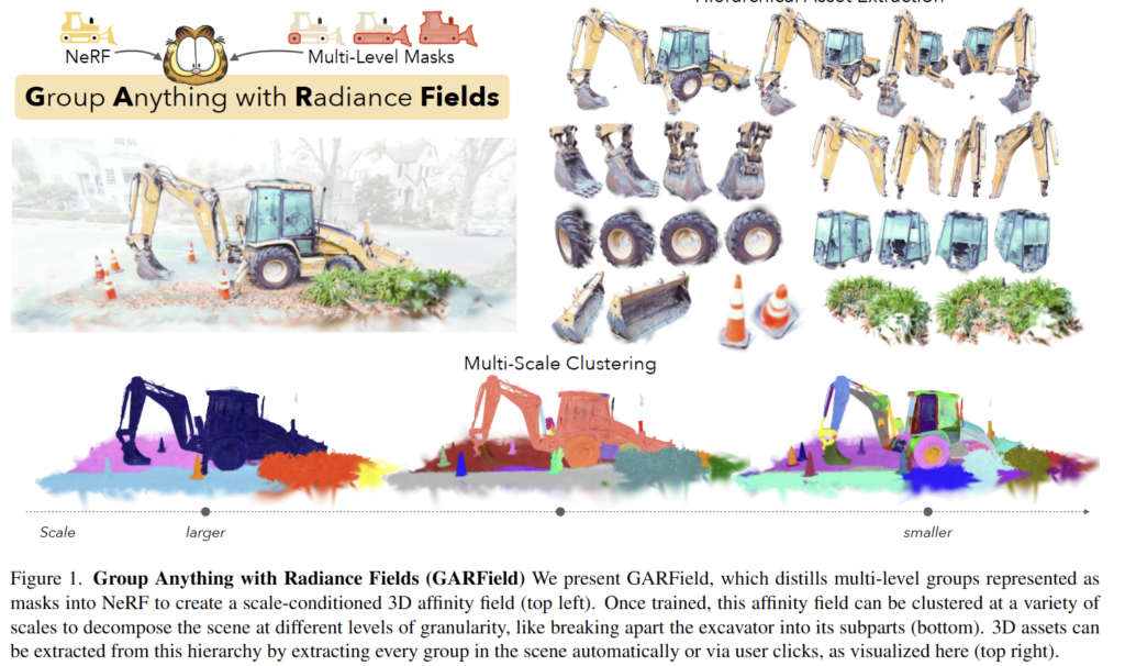인간은 장면을 다양한 수준의 세분화된 영역들을 알아서 인지할 수 있는 고유한 능력을 지니고 있습니다. 예를 들어,fig 1에서 보이는 바와 같이 굴착기를 하나의 단일체로 보는 것에서부터 바퀴, 크레인, 운전실과 같은 하위 부품을 식별하는 것까지 가능합니다. 이러한 계층적 인지는 복잡한 3D 환경을 이해하고 상호작용하는 데 필수적입니다. 기존 NeRF는 이러한 다중 레벨의 그룹화를 포착하지 못하여 장면을 의미적으로 해석하는 능력에 큰 한계를 보이고 있습니다.