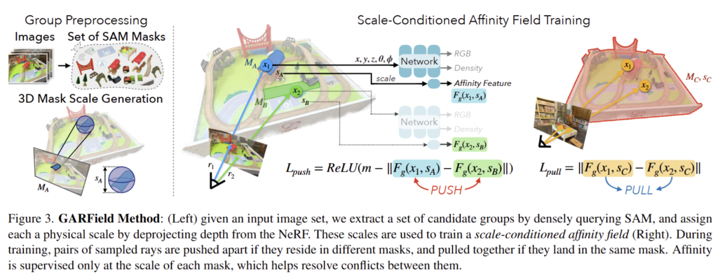 GARField는 연속적인 이미지들을 입력으로 받아 standard 3D volumetric radiance fields와 scale-conditioned affinity field를 활용하여 장면에 대한 계층적 3D 그룹을 생성합니다. 이를 수행하기 위해서 입력 이미지들을 SAM으로 사전 처리하여 마스크 후보군들을 획득합니다. 그 다음, single 3D location과 euclidean scale을 사용하는 affinity filed와 함께 volumetric radiance field를 최적하하고 feature vector를 출력합니다. 여기서 affinity는 points의 feature vectors 쌍들을 비교하여 획득합니다.