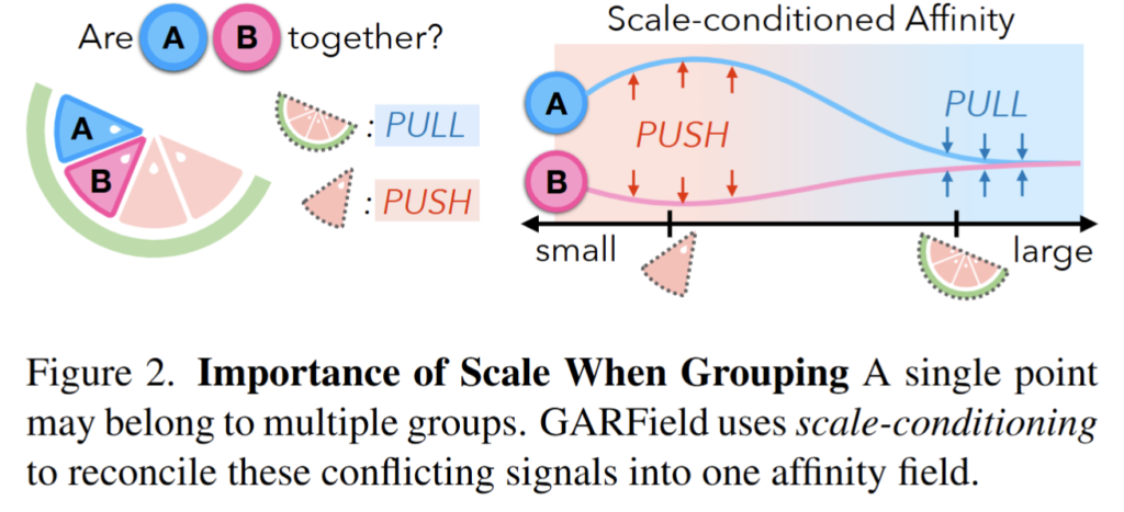 이 특징들은 NeRF density를 기반으로 동일한 렌더링 가중치를 사용하여 가중 평균 방식으로 볼륨 렌더링할 수 있으며, ray 단위로 값을 얻을 수 있습니다. fig 2는 이러한 Scale-Conditioned Affinity Field가 점들 간의 affinity를 어떻게 계산하는지 시각적으로 보여줍니다.