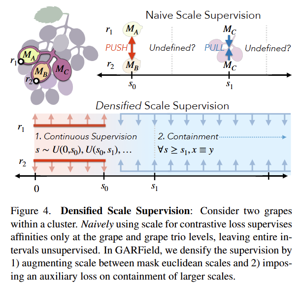 Containment Auxiliary Loss. 만약 두 광선 r_1과 r_2이 스케일 s에서 동일 마스크에 속한다면, 더 큰 스케일에서도 함께 묶여야 합니다. 직관적으로, 동일 클러스터 내의 두 포도알은 더 큰 스케일에서도 함께 그룹화됩니다(예: 포도송이 전체). 각 학습 단계에서, 스케일 s에서 그룹화된 광선에 대해 더 큰 스케일 s’을 샘플링하여 해당 광선들이 이 스케일에서도 함께 묶이도록 합니다. 이를 통해 작은 스케일에서의 affinity가 더 큰 스케일에서도 유지되도록 보장합니다.