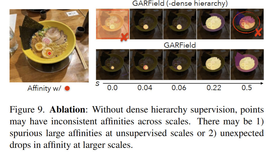 기존 constrastive loss만으로는 계층 구조를 유지하기에 충분하지 않습니다. 예를 들어, fig 9보면 scale 0.22에서는 달걀이 수프와 올바르게 그룹화되었으나, 더 큰 스케일에서는 분리됩니다. 이러한 그룹화 불안정성의 원인은 저자는 다음과 같이 가정을 세웁니다. 1) 마스크가 존재할 때만 스케일 감독이 희소하게 정의되며, 2) 작은 스케일 그룹이 더 큰 스케일에서 유지되도록 강제하는 요소가 없기 때문이라고 가정합니다. 저자는 이를 해결하기 위해 2가지 기법을 제시합니다.