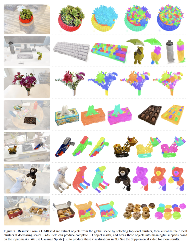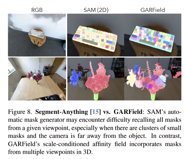 fig 8에서는 단독 이미지에서의 SAM으로 분할을 수행한 결과입니다. 저자가 제안한 기법들은 다양한 시점을 기반으로 분할이 가능하기 때문에 세밀한 부분까지 깔끔하게 구분하는 결과를 보여줍니다.