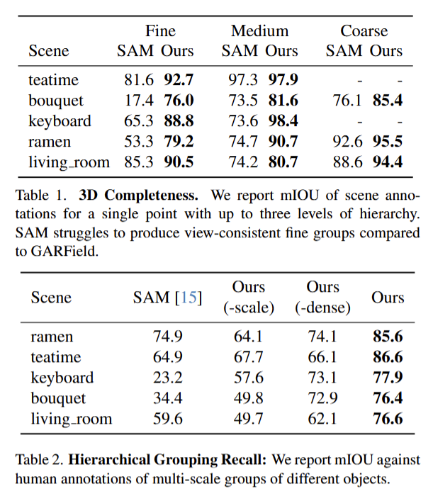 Tab 1,2에서는 SAM과 저자가 제안한 기법을 기반으로 한 mIOU 성능 비교 분석 결과입니다. 여러 뷰포인트를 고려 가능하기 때문에 단독 뷰포인트를 활용하는 SAM 보다 좋은 성능을 보여주고 있습니다. 또한 Tab 2에서는 mask에 대한 scale만 이용한 기법과 dense 있도록 학습을 구성한 기법만 사용한 결과를 비교합니다.
