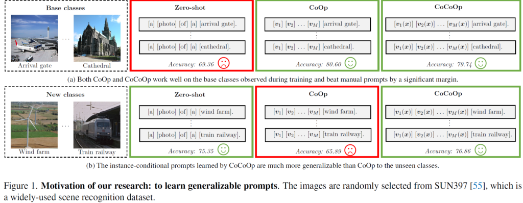 본 논문은 CoOp와 동일한 저자들이 수행한 연구로, 학습때 보지 못한 new classes에 대한 일반화 성능이 낮다는 CoOp의 문제점을 꼬집고 새로운 방식을 제안하게 됩니다. 위 그림 1에서 3가지 프롬프트 방식에 대한 base/new classes 성능 비교를 살펴보면 꽤나 인상적입니다.