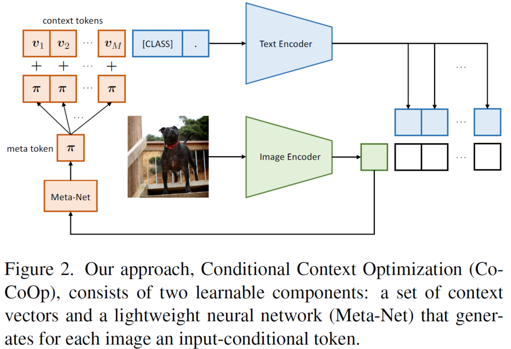 CoOp의 낮은 일반화 성능을 해결하기 위해, 조건부 프롬프트 학습 (conditional prompt learning) 이라고 하는 새로운 개념을 제안합니다. 핵심 아이디어는 한번 학습된 프롬프트가 고정되지 않고 각 입력 이미지 (instance)에 따라 유동적인 조건부 프롬프트를 만드는 것입니다. 얕은 신경망으로 구성된 Meta-Net을 추가적으로 구성하여 각 입력 이미지 feature로 부터 meta token 을 생성한 후 기존 CoOp의 학습 가능한 context vector와 더해지는 방식으로 프롬프트를 구성하게 됩니다. 방식은 매우 간단하며, 이에 대한 개념도는 아래와 같습니다.