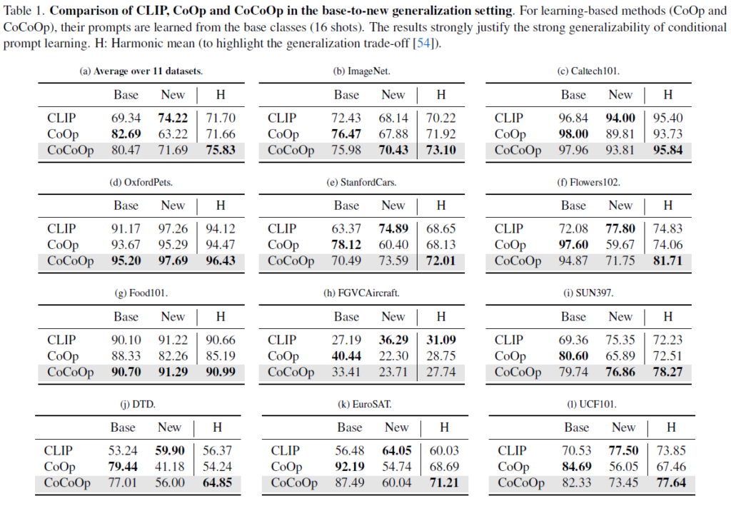 앞선 CoOp 의 약한 일반화 성능 문제 해결이 본 연구의 핵심이였습니다. 이를 비교하기 위해 11개의 datasets에 대해서 비교 실험을 진행하였고, 아래 표 1을 보시면 됩니다. base classes에 대한 학습 후, base/new classes 에 대한 평가를 진행 한 결과입니다.