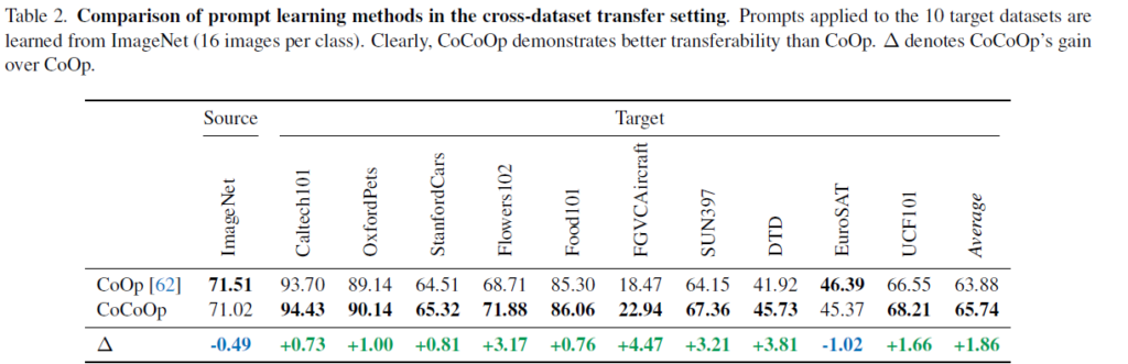 1000개의 class, 각 class 당 16장의 이미지를 사용하여 context prompt 를 학습한 후 다른 10개의 target dataset에서의 성능 평가를 수행한 결과입니다. source 에서는 유사한 성능을 보인대에 반해 target 에서의 평균치를 보면 약 2%의 성능 향상이 이루어 진 것을 볼 수 있습니다.