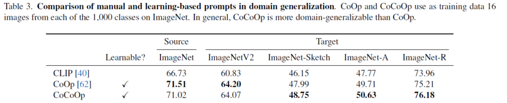 CLIP 과 비교했을 때 CoOp, CoCoOp 모두 source ImageNet 에서도 4 이상의 성능 향상을 달성하였습니다. 또한 target 상황에서의 CoOp vs CoCoOp 성능을 비교했을 때 ImageNetV2를 제외하고는 더 높을 일반화 성능을 달성하였습니다. 이를 통해 저자들은 intance conditional prompts 방식이 DG에서도 좋은 역할을 한다고 주장합니다.