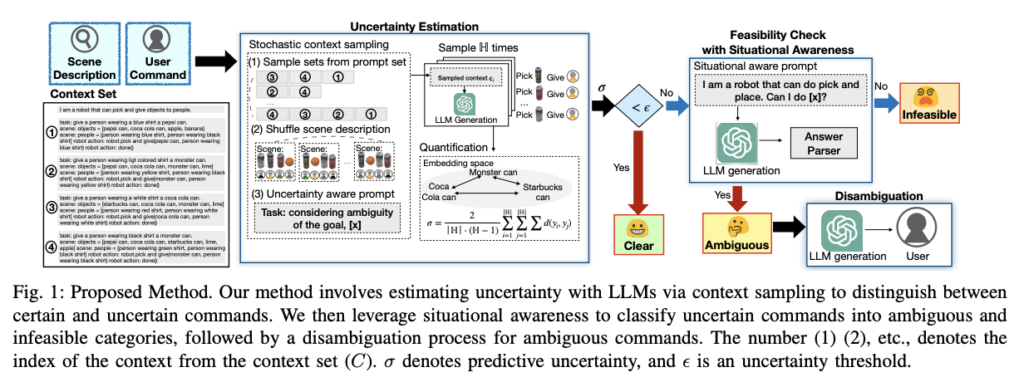 본 논문에서는 신뢰성 있는 system을 구축하고자 주어진 사용자의 명령이 명확한지, 모호한지 또는 실행 불가능한지를 추론하는 것을 목표로 합니다. 이를 위해서 본 논문에서는 불확실성 추정 방법을 이용하여 해당 명령의 불확실성을 측정하고, 명령이 명확하다고 분류되면 이를 처리하고 그렇지 않은 경우에는 상황에 맞는 context prompt를 활용하여 모호한 명령과 실행 불가능한 명령을 구별합니다. 모호한 명령의 경우, 사용자와의 상호작용을 통해 질문을 생성하여 명령을 명확히 합니다.