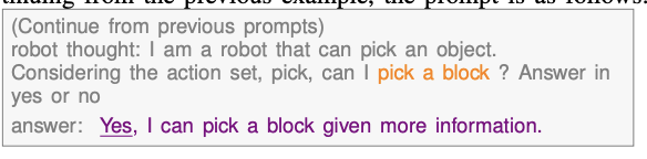 처음에는, 로봇의 능력에 따라 prompt의 마지막 줄을 구성하여 목표의 실행 가능성을 평가합니다. 먼저, 로봇의 유형과 로봇이 수행할 수 있는 가능한 동작을 prompt에 추가하여 agent가 자신의 상황을 인식하도록 합니다. 그런 다음 LLM에게 로봇이 task를 수행할 수 있는지를 “Yes” 혹은 “No”로 binary classification하도록 유도합니다.