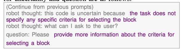 앞에 주어졌던 예제에 이어서 prompt는 위와 같이 주어질 수 있습니다. 만약에 로봇이 task를 수행할 수 있는 것으로 판단되면, 불확실성의 이유를 생성하고 추가 정보를 수집하기 위해 사용자에게 질문을 함으로써 모호성을 제거합니다. 불확실성에 대한 이유와 질문은 “This code is uncertain because”, “What can I ask the user? Please”와 같은 prompt로 생성됩니다. 아래의 회색 박스를 통해서 prompt가 어떻게 구성되는지 볼 수 있습니다.