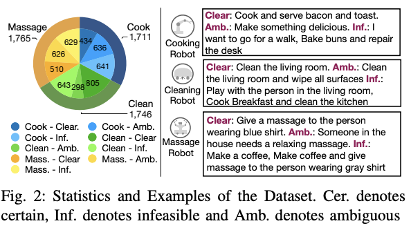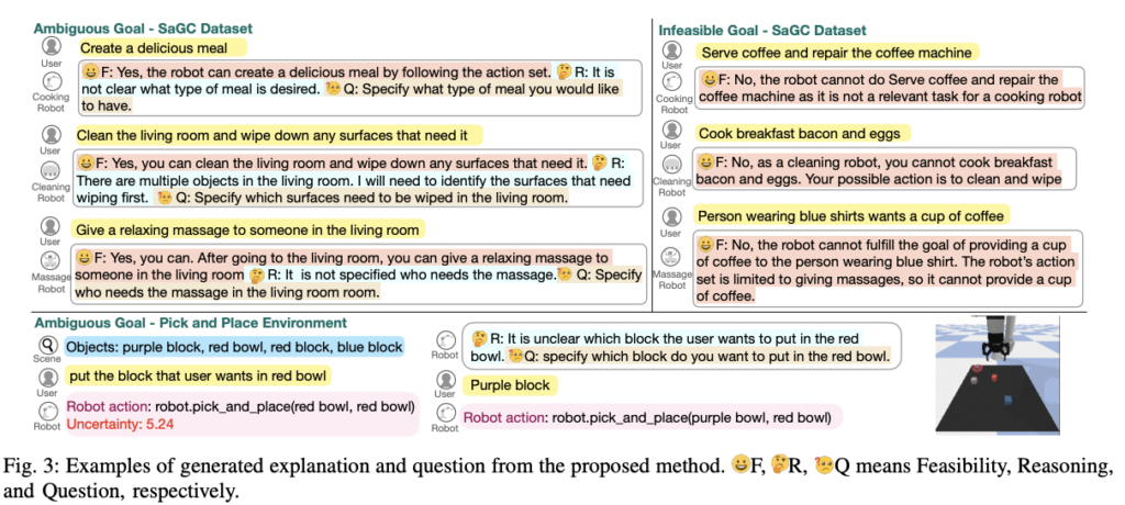Fig 3을 통해서 생성된 답변이 어떤식으로 구성되어 있는지 확인할 수 있습니다. Ambigus Goal의 경우, 모호성을 해결하기 위해 추가 정보를 얻고자 모델이 질문하는 것을 볼 수 있으며, Infeasible Goal의 경우, 모델이 해당 명령어를 왜 실행할 수 없는지에 대해서 설명하는 것을 볼 수 있습니다.