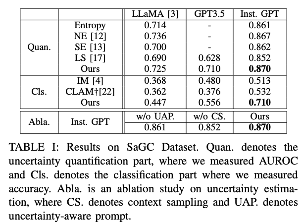 해당 데이터셋은 AUROC (area under the ROC curve)와 classification accuracy를 이용하여서 평가를 진행합니다. Table 1을 통해서 제안된 방법론의 성능을 확인하실 수 있습니다. base가 되는 LLM을 바꿔가며 평가를 진행하였고, LLaMA, GPT3.5에 비해서 InstructGPT에서 성능이 높으며, 그 중에서도 본 논문에서 제안된 방법론의 성능이 가장 높은 것을 확인할 수 있습니다.