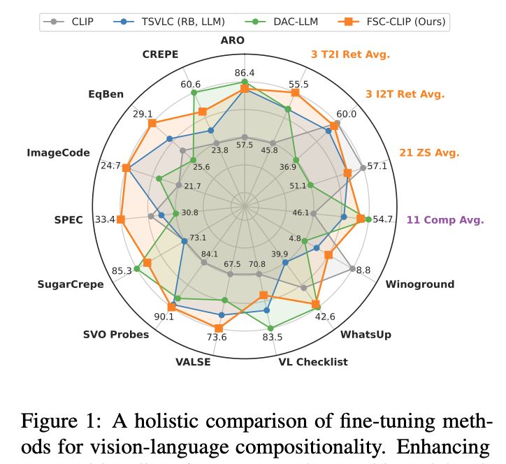 저자들은 이러한 한계를 극복하기 위해, 정밀한 representation을 사용하는 Fine-tuning 기법인 FSC-CLIP(Fine-grained Selective Calibrated CLIP)을 제안하였습니다. 이는 Hard Negative Loss의 한계를 대응하면서, Composionality와 멀티모달 성능 사이의 균형을 유지하는 데에 집중할 수 있었습니다.