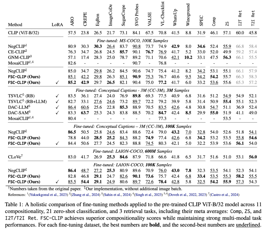 FSC-CLIP은 LoRA를 활용한 Fine-Tuning으로 중간 단계에서 ZS score 58과 Comp score 50을 달성하며, 다른 모델을 뛰어넘는 결과를 보였습니다. 완전 Fine-Tuning 상태에서는 Comp score에서 높은 성능을 보이면서, ZS 성능의 저하를 최소화하여 CLoVe와 CE-CLIP 대비 더 나은 균형을 유지하였다고 합니다. 반면, DAC-LLM은 ZS 성능이 크게 하락하고 Comp 점수는 단 0.5포인트 상승하는 데 그쳤습니다. FSC-CLIP은 완전 Fine-Tuning 상태에서도 ZS 점수에서 DAC-LLM을 4.9포인트 넘기며 안정적인 성능을 보였습니다. 저자가 주장하는 FT 과정에도 Compositionality와 Multi-modal 성능의 균형을 확인할 수 있는 결과인 것 같네요