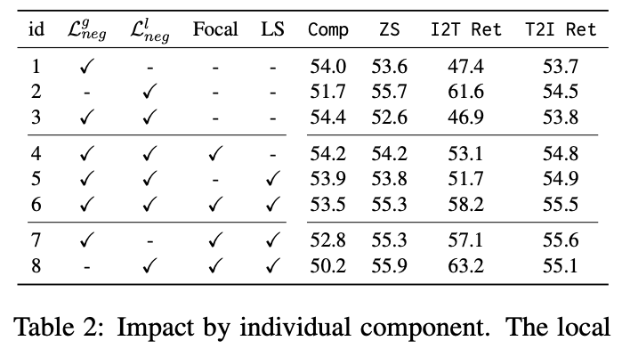 • row 3: global HN loss와과 함께 적용하면 Comp 점수는 향상되지만 ZS와 I2T Ret 점수는 감소하는 트레이드오프가 발생