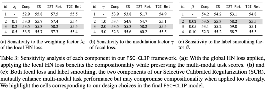 • Table 3b: focal loss 계수 γ를 늘리면 멀티모달 성능 향상되지만, 너무 크게 증가할 경우, HN 텍스트의 학습 신호가 약화되어 Comp 성능 하락