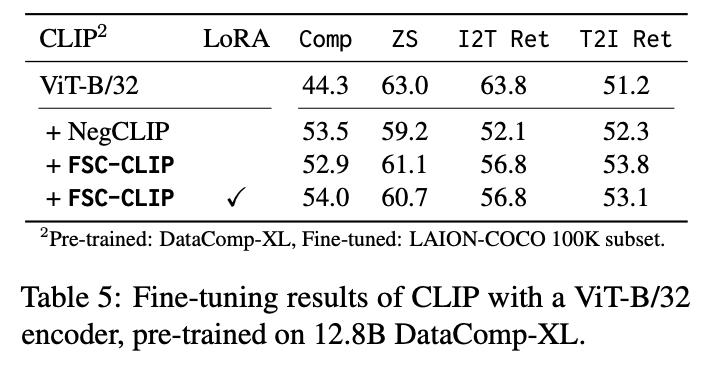 상단 테이블 5에 대규모 Pre-training 데이터가 Fine-Tuning에 미치는 영향을 분석한 결과를 나타냅니다. 12.8B 샘플로 Pre-training한 CLIP 모델은 ZS 에서 63.0을 기록하며 기존 OpenAI CLIP(400M 샘플) 대비 멀티모달 성능이 향상되었습니다. Comp에서는 OpenAI CLIP와 차이가 없었습니다. Fine-Tuning에서는 NegCLIP이 멀티모달 작업 성능을 크게 저하시킨 반면, FSC-CLIP은 LoRA를 활용해 이러한 성능 저하를 방지했고, NegCLIP보다 높은 Comp 점수를 달성할 수 있었습니다.