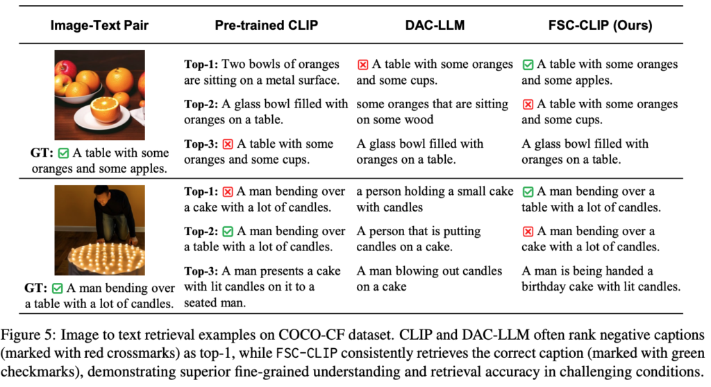 각 이미지에 대해 모델이 찾은 상위 3개의 캡션이 나타난 것으로, 정답은 녹색 체크, 오답은 빨간색 X로 표시됩니다. CLIP과 DAC-LLM은 종종 오답인 캡션을 Top-1로 예측하여, Hard Negative 텍스트에 취약한 모습을 보였습니다. 반면 FSC-CLIP은 일관적으로 올바른 캡션을 1위로 검색하며, Hard Negative 텍스트가 포함된 상황에서도 뛰어난 검색 성능과 Compositionality 능력을 확인할 수 있어씁니다.