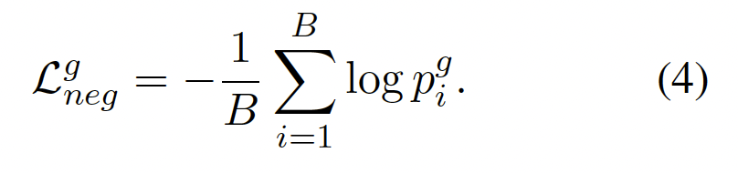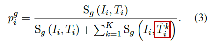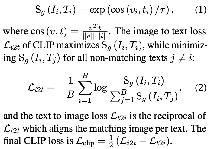 CLIP Loss. CLIP은 이미지를 visual token V_i으로, 텍스트를 text token T_i으로 인코딩하여 멀티모달 임베딩 스페이스에서의 공통 벡터로 변환합니다. 이후, 이 global 벡터인 V_i, T_i를 Pooling 연산(ArgMax)을 통해 v_i, t_i로 변환하고 이를 기반으로 이미지와 텍스트 간의 유사도를 측정합니다. 이를 global 벡터를 사용한 유사도 S_g 연산 수식은 아래 (1)과 같고, 수식 (2)와 같은 방식으로 CLIP Loss를 계산합니다.