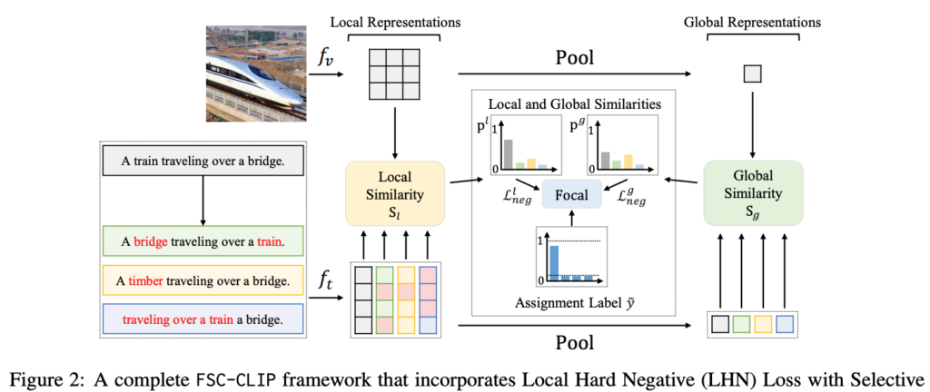 저자는 Compositionality를 개선하면서 Multi-modal 성능을 보존하기 위해, CLIP을 Fine-tuning 하는 방법인 FSC-CLIP를 제안하였습니다. FSC-CLIP은 크게 두 가지 요소로 구성됩니다: Local Hard Negative (LHN) LossSelective Calibrated Regularization (SCR). 전체적인 프레임워크는 상단 그림 2에서 확인할 수 있습니다.